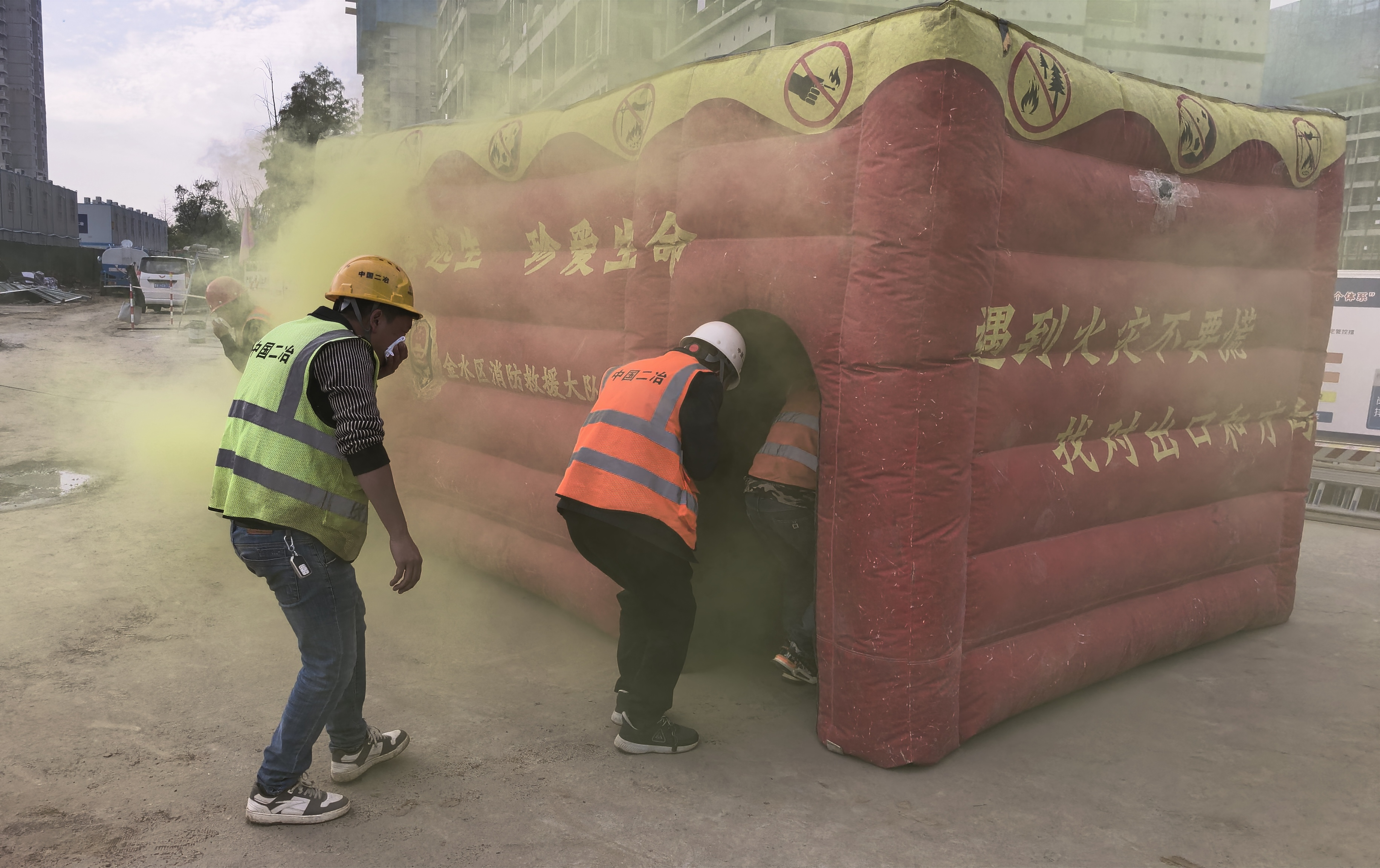 實(shí)戰(zhàn)環(huán)節(jié)的“模擬火災(zāi)逃生屋”成為演練核心。這個(gè)充氣裝置通過迷宮通道、無毒煙霧與聲光系統(tǒng),高度還原火災(zāi)現(xiàn)場(chǎng)環(huán)境。應(yīng)急指揮組提前明確“3人一組、低姿撤離”等規(guī)范,詳解逃生屋結(jié)構(gòu)與標(biāo)識(shí),確保體驗(yàn)安全可控。