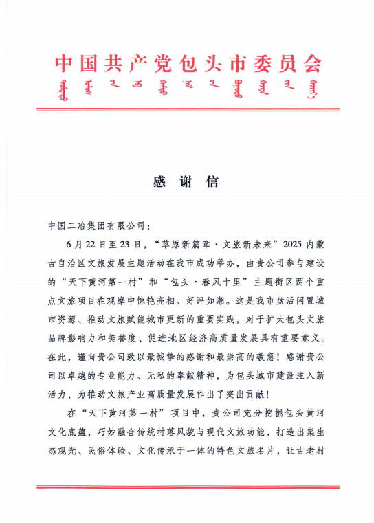 6月30日,中國二冶收到包頭市委、市政府發(fā)來的表揚(yáng)信,對(duì)中國二冶在“天下黃河第一村”和“包頭?春風(fēng)十里”兩大重點(diǎn)文旅項(xiàng)目建設(shè)中作出的卓越貢獻(xiàn),給予高度贊譽(yù)。?