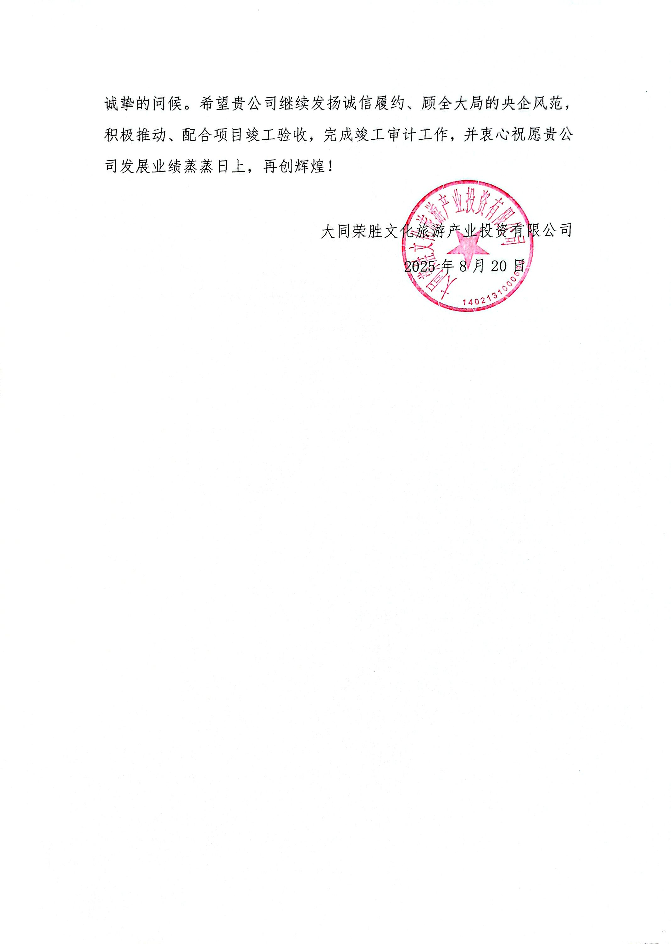 8月21日,中國二冶收到大同榮勝文化旅游產(chǎn)業(yè)投資有限公司發(fā)來的表揚(yáng)信,信中對中國二冶內(nèi)蒙古分公司在項(xiàng)目建設(shè)中的卓越表現(xiàn)給予高度認(rèn)可。?