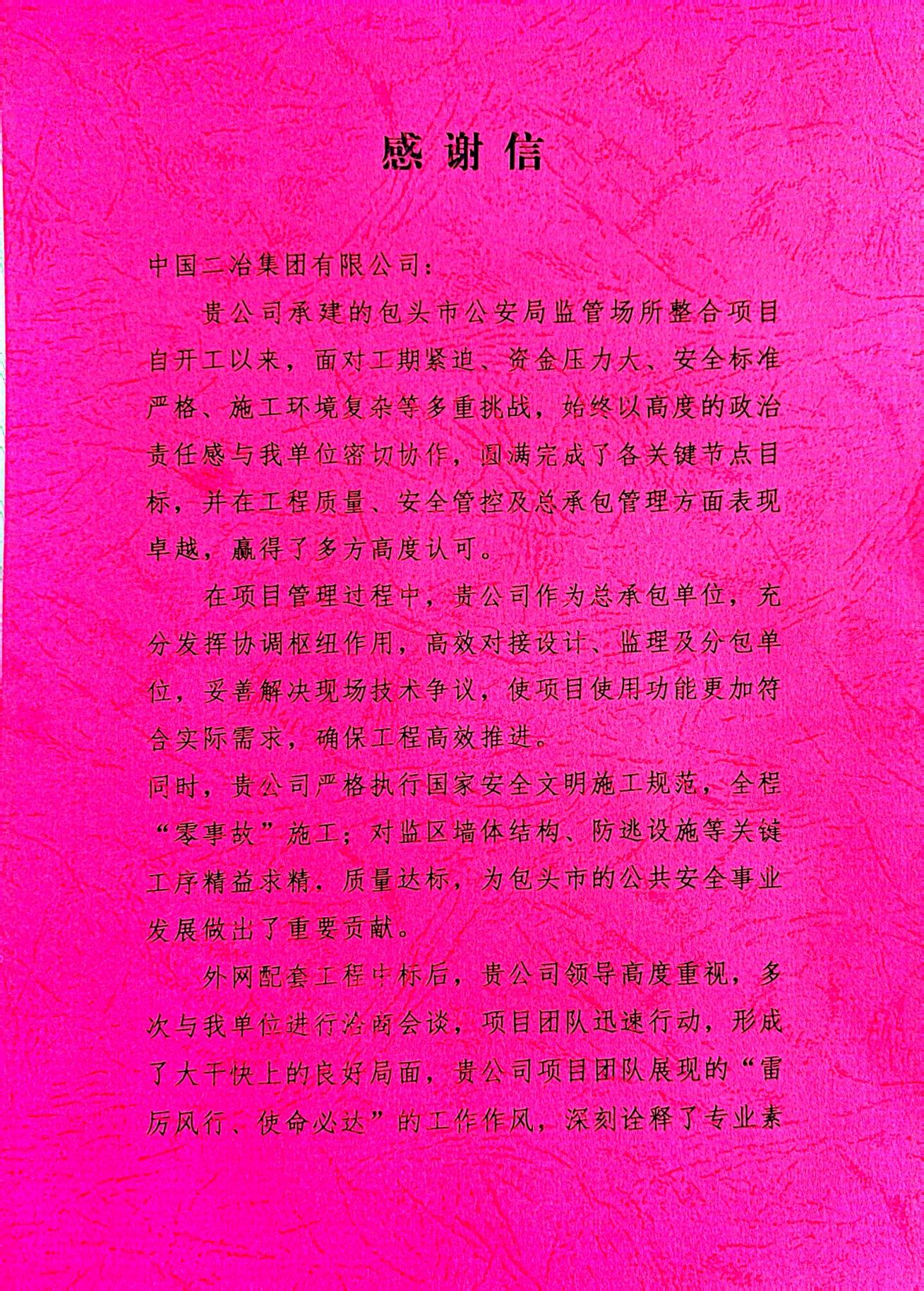 信中指出,貴公司作為總承包單位,充分發(fā)揮協(xié)調(diào)樞紐作用,高效對(duì)接設(shè)計(jì)、監(jiān)理及分包單位,妥善解決現(xiàn)場(chǎng)技術(shù)爭(zhēng)議,使項(xiàng)目使用功能更加符合實(shí)際需求,確保工程高效推進(jìn)。同時(shí)嚴(yán)格執(zhí)行國(guó)家安全文明施工規(guī)范,全程“零事故”施工;對(duì)監(jiān)區(qū)墻體結(jié)構(gòu)、防逃設(shè)施等關(guān)鍵工序精益求精,質(zhì)量達(dá)標(biāo),為包頭市的公共安全事業(yè)發(fā)展做出了重要貢獻(xiàn)。今年,在外網(wǎng)配套工程中標(biāo)后,貴公司第一時(shí)間響應(yīng),相關(guān)領(lǐng)導(dǎo)高度重視,多次與我單位進(jìn)行洽商會(huì)談,項(xiàng)目團(tuán)隊(duì)迅速行動(dòng),人、材、機(jī)第一時(shí)間到位,形成了大干快上的良好局面,項(xiàng)目團(tuán)隊(duì)展現(xiàn)的 “超越自我、挑戰(zhàn)極限”的作風(fēng),以及使命必達(dá)的執(zhí)行力,深刻詮釋了專業(yè)素養(yǎng)與國(guó)企擔(dān)當(dāng)。