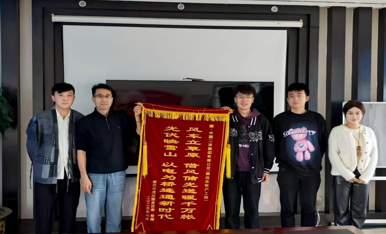 錦旗上題寫“風車立草原,借風儲光送暖千萬帳;光伏映雪山,以電為橋連通新時代”,生動詮釋了項目的核心價值與深遠意義。新巴爾虎左旗政府表示,該項目地處內蒙古偏遠牧區(qū),氣候條件惡劣、交通出行不便,整體施工環(huán)境極為艱苦。面對挑戰(zhàn),項目管理團隊充分發(fā)揮技術與管理優(yōu)勢,始終以“高標準、高質量、高效率”為施工準則,全力克服物資運輸困難、極端天氣影響等多重難題,最終如期完成節(jié)點任務。該項目的順利推進,不僅成功解決了當?shù)剞r牧民的急難愁盼問題,直接惠及數(shù)百戶農牧民家庭,顯著提升了牧區(qū)群眾的生活品質;更通過產業(yè)配套升級,為當?shù)亟洕沙掷m(xù)發(fā)展注入了新動能,為邊疆牧區(qū)發(fā)展奠定了堅實基礎。