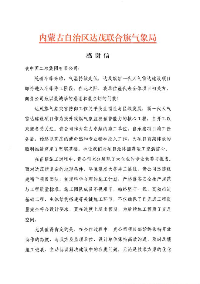 11 月 16 日,中國二冶收到內(nèi)蒙古自治區(qū)達(dá)茂聯(lián)合旗氣象局發(fā)來的感謝信,信中對公司在達(dá)茂旗新一代天氣雷達(dá)建設(shè)項目施工中的專業(yè)表現(xiàn)與辛勤付出給予高度肯定,并致以誠摯感謝。