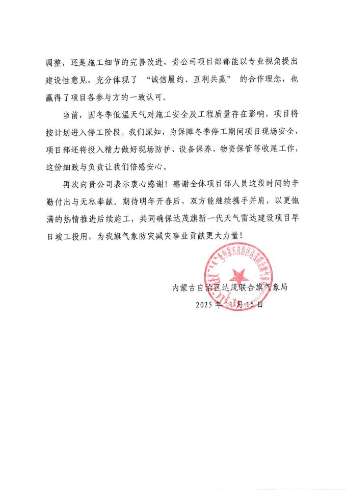 合作期間,項目部始終秉持開放協(xié)作態(tài)度,與氣象局、監(jiān)理單位及設(shè)計單位建立高效溝通機(jī)制,及時反饋施工進(jìn)展,主動協(xié)調(diào)解決建設(shè)中的各類問題。同時,在技術(shù)方案優(yōu)化、施工細(xì)節(jié)完善等方面積極提出建設(shè)性意見,切實踐行 “誠信履約、互利共贏” 的合作理念,贏得了項目各參與方的一致認(rèn)可。針對冬季低溫天氣對施工安全及工程質(zhì)量的影響,項目部還細(xì)致部署現(xiàn)場防護(hù)、設(shè)備保養(yǎng)、物資保管等冬季停工收尾工作,盡顯嚴(yán)謹(jǐn)負(fù)責(zé)的工作態(tài)度。 此次感謝信的送達(dá),極大鼓舞了項目部全體人員的士氣,既是對中國二冶高質(zhì)量管理與實干擔(dān)當(dāng)?shù)某浞终J(rèn)可,也為團(tuán)隊注入了強(qiáng)勁動力。